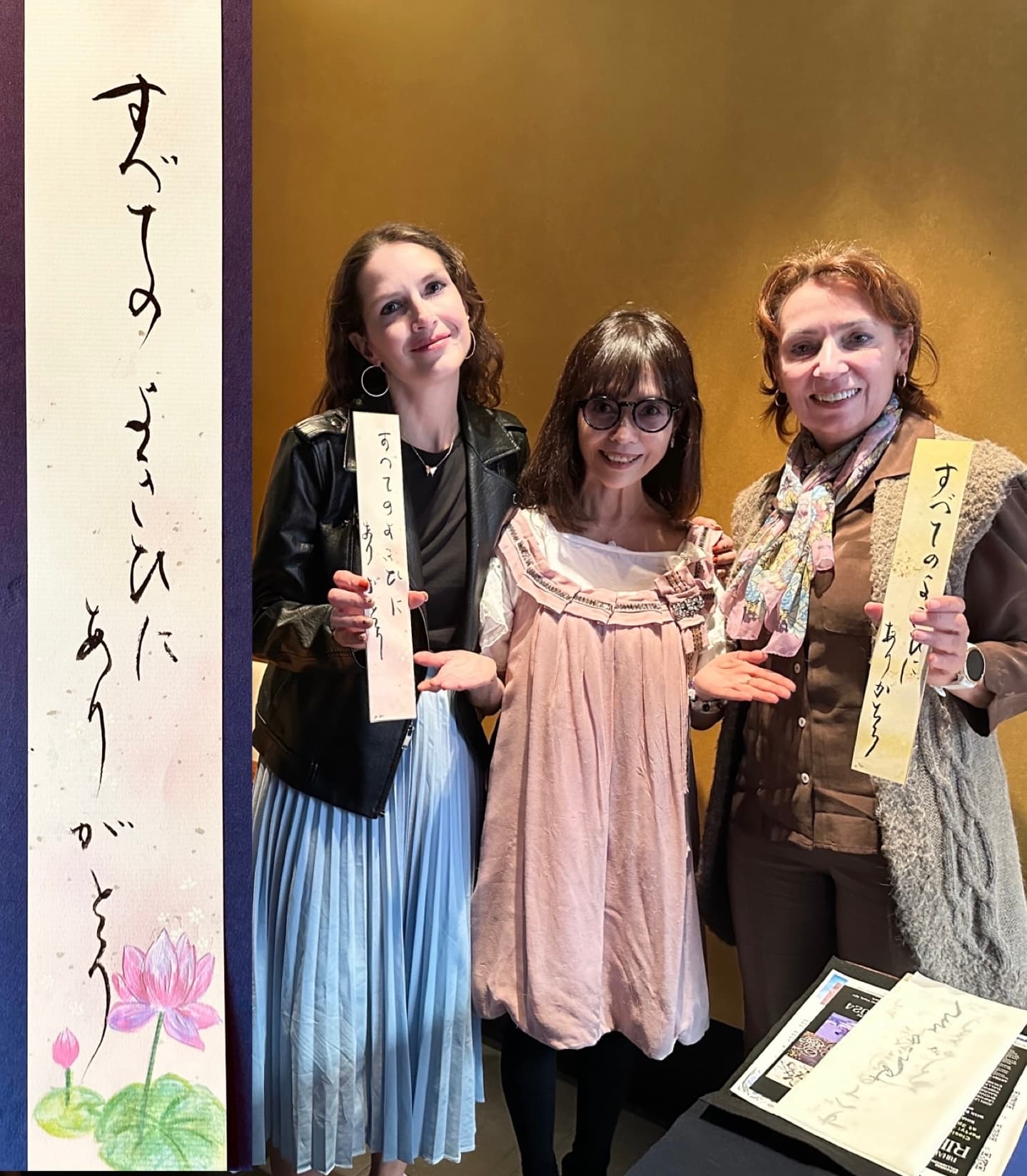 参加者は着物を着て、扇子に書をしたためました。書いた言葉は「昇龍躍進」— 龍が空に昇るごとく、我々の更なる躍進の願いを込めて。「日日是好日」— すべてのよき日に ありがとう。禅の言葉を、日本独特のひらがなで表現しました。参加者は、各々作成した唯一無二の作品を持ち帰っていただきました。