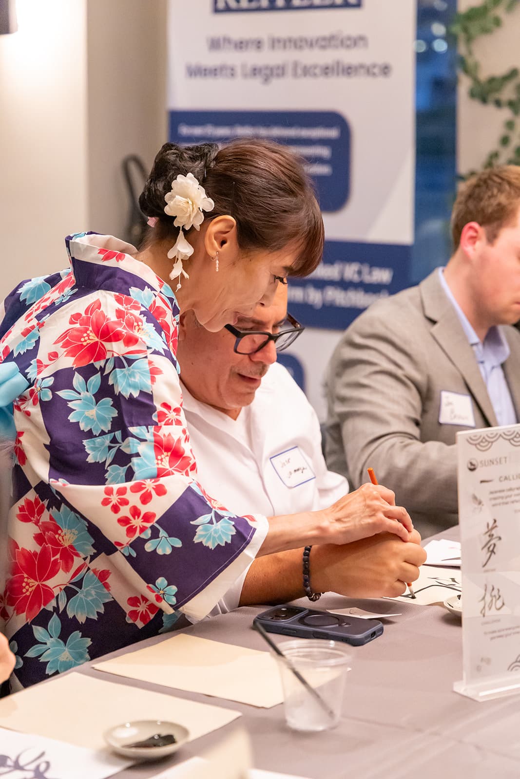REITLERからのご依頼イベント、日本文化 書道で集う特別な夜。「言霊(kotodama)」をテーマに、起業家や投資家の方々に「成長」「挑戦」「繁栄」など、それぞれの歩みに重なるポジティブな漢字の書を指導しました。